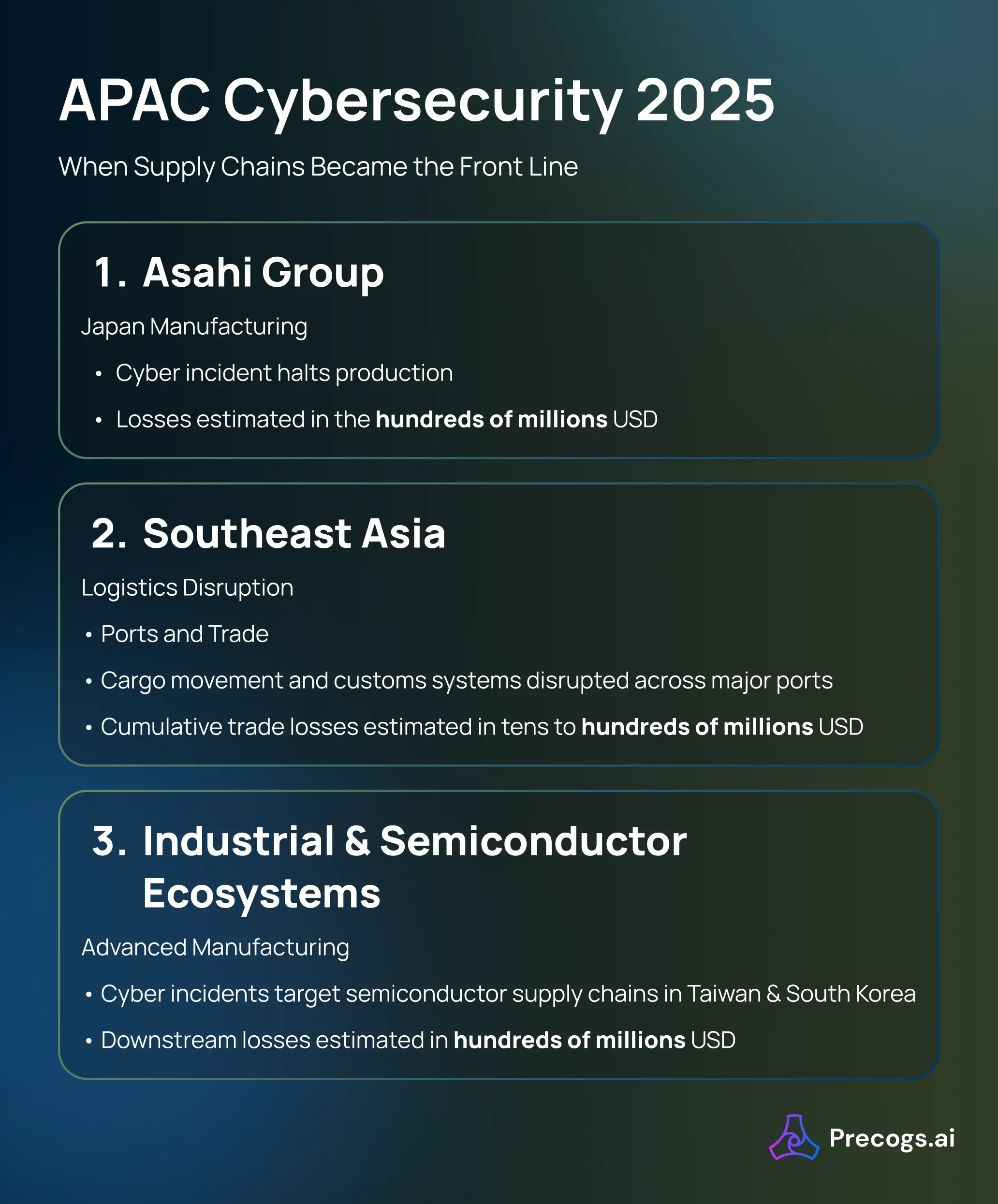 Cyber incidents in APAC did not stay local. They halted manufacturing lines, disrupted logistics corridors, and sent shockwaves through global supply chains. From Japan and Southeast Asia to Australia and India, the most serious incidents shared a defining characteristic: software failures translated directly into physical and economic disruption.