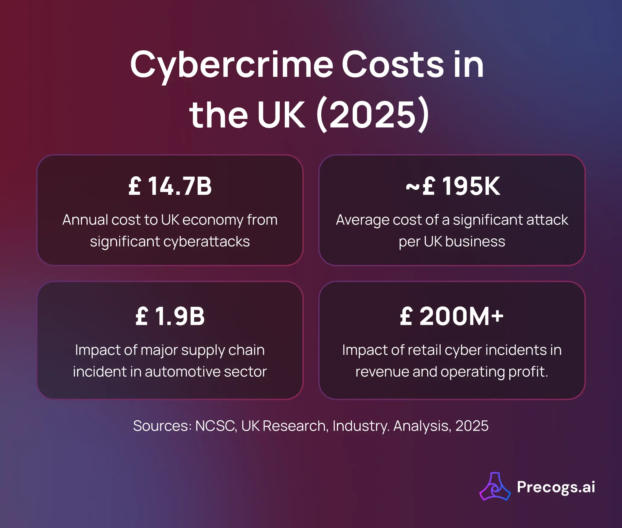 - In addition to the broad national cost, individual large-scale incidents have inflicted hundreds of millions to billions of pounds in damage. For example, independent analysis of a major automotive supply chain incident in 2025 suggested the economic impact could be as high as £1.9 billion to the broader UK economy, factoring in output losses across suppliers and production delays. The Guardian